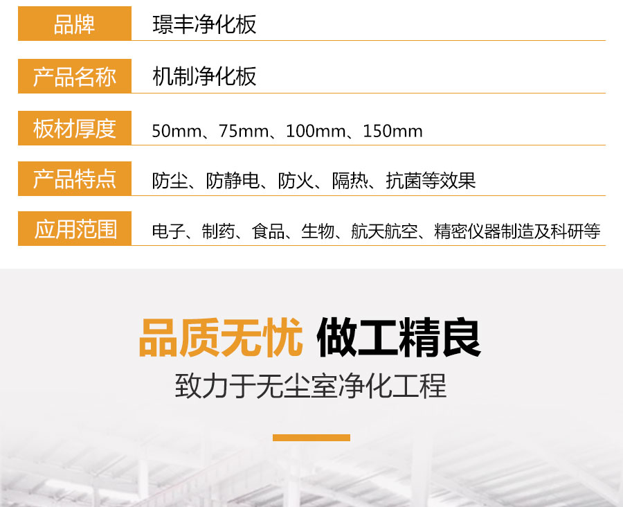 聚氨酯凈化巖棉板又稱潔凈板是由彩涂板、不銹鋼等材質作為面材的復合板,因其具有獨特的防塵、防靜電、抗菌等效果,被廣泛應用于電子、制藥、食品、生物、航天航空、精密儀器制造及科研等對室內環境要求苛刻的凈化工程領域。